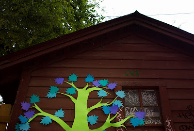 My art is being displayed in an alley-way behind my apartment complex. Using different colors of fluorescent computer paper, I constructed a tree that stands about eight feet tall and stuck it behind a house.